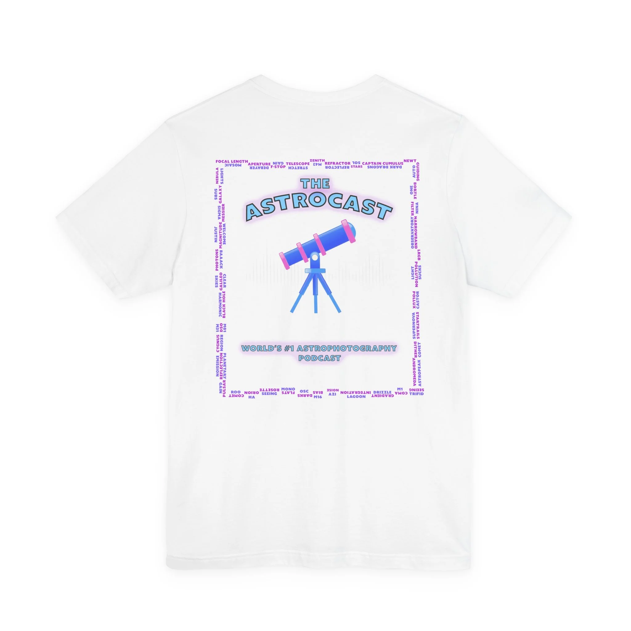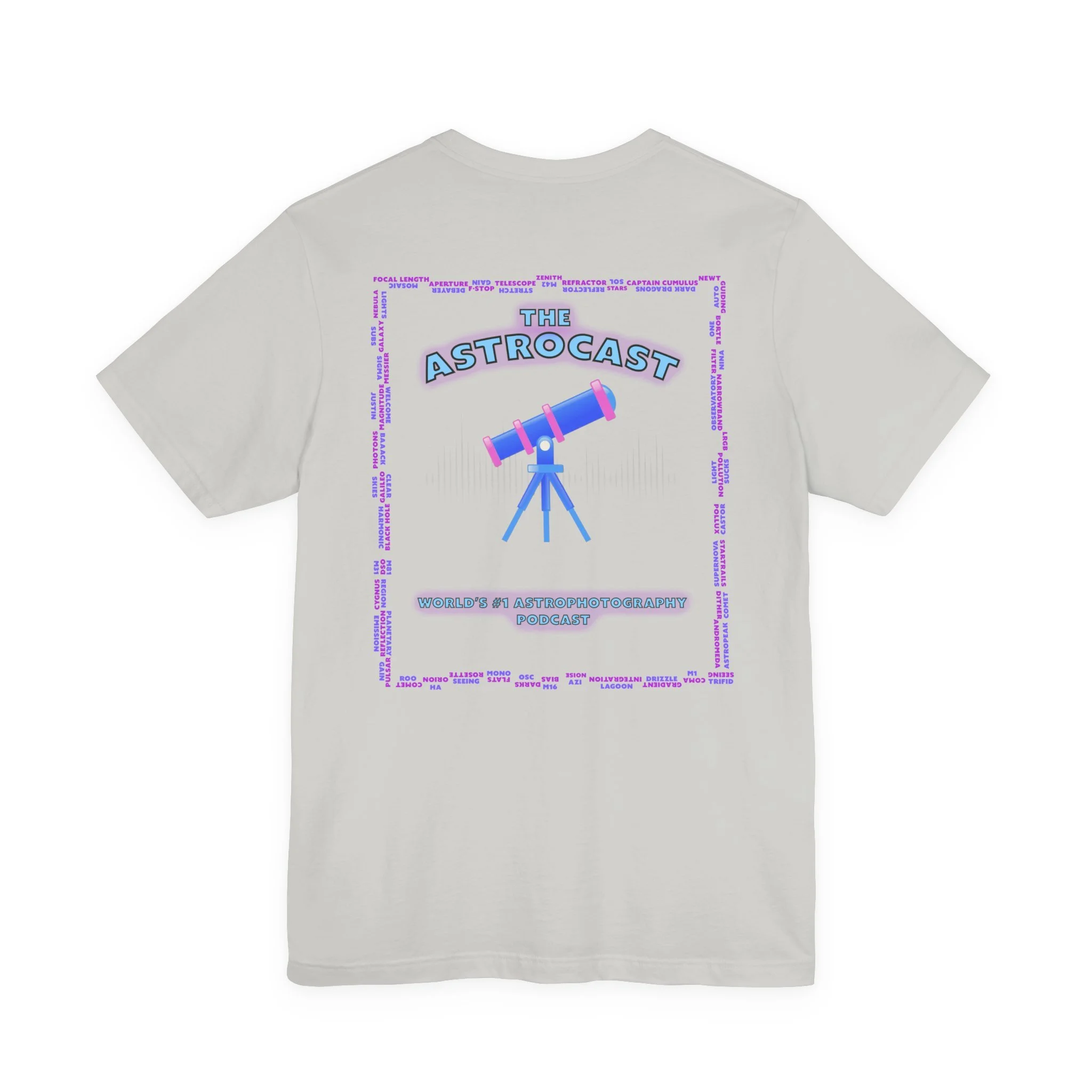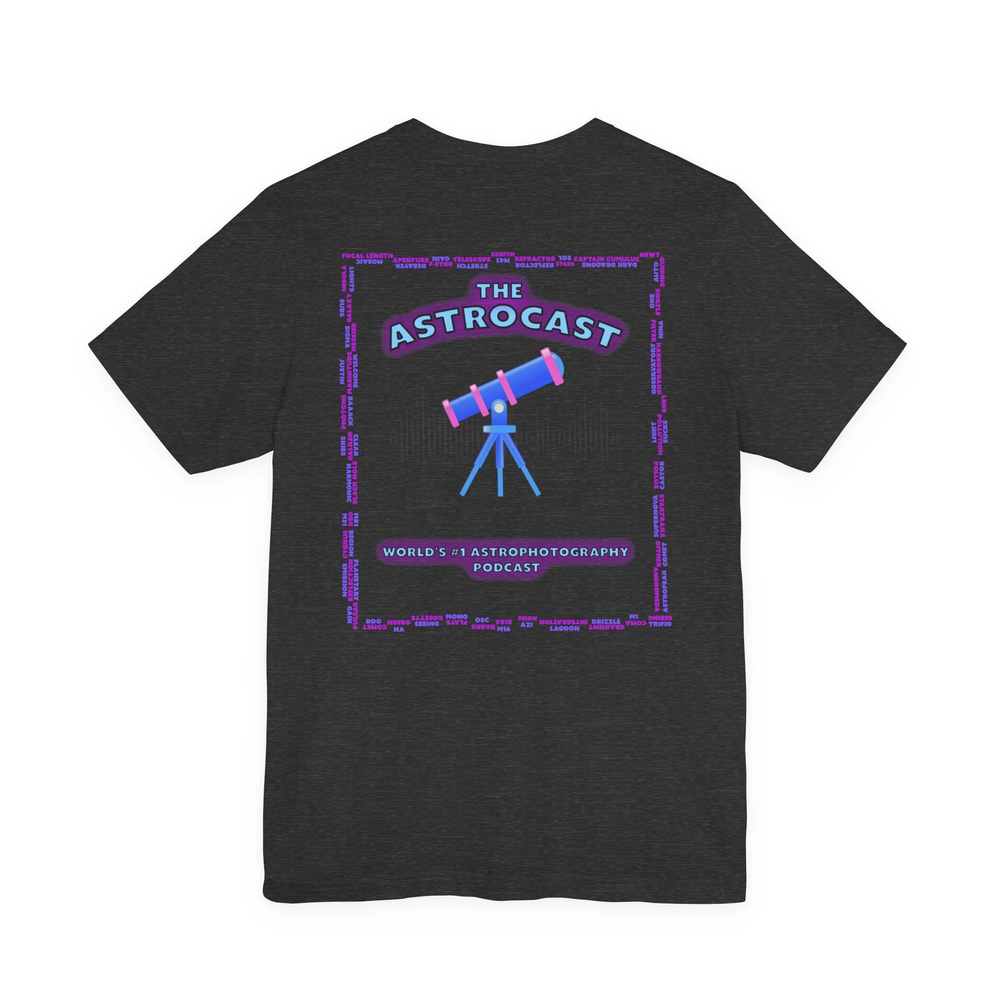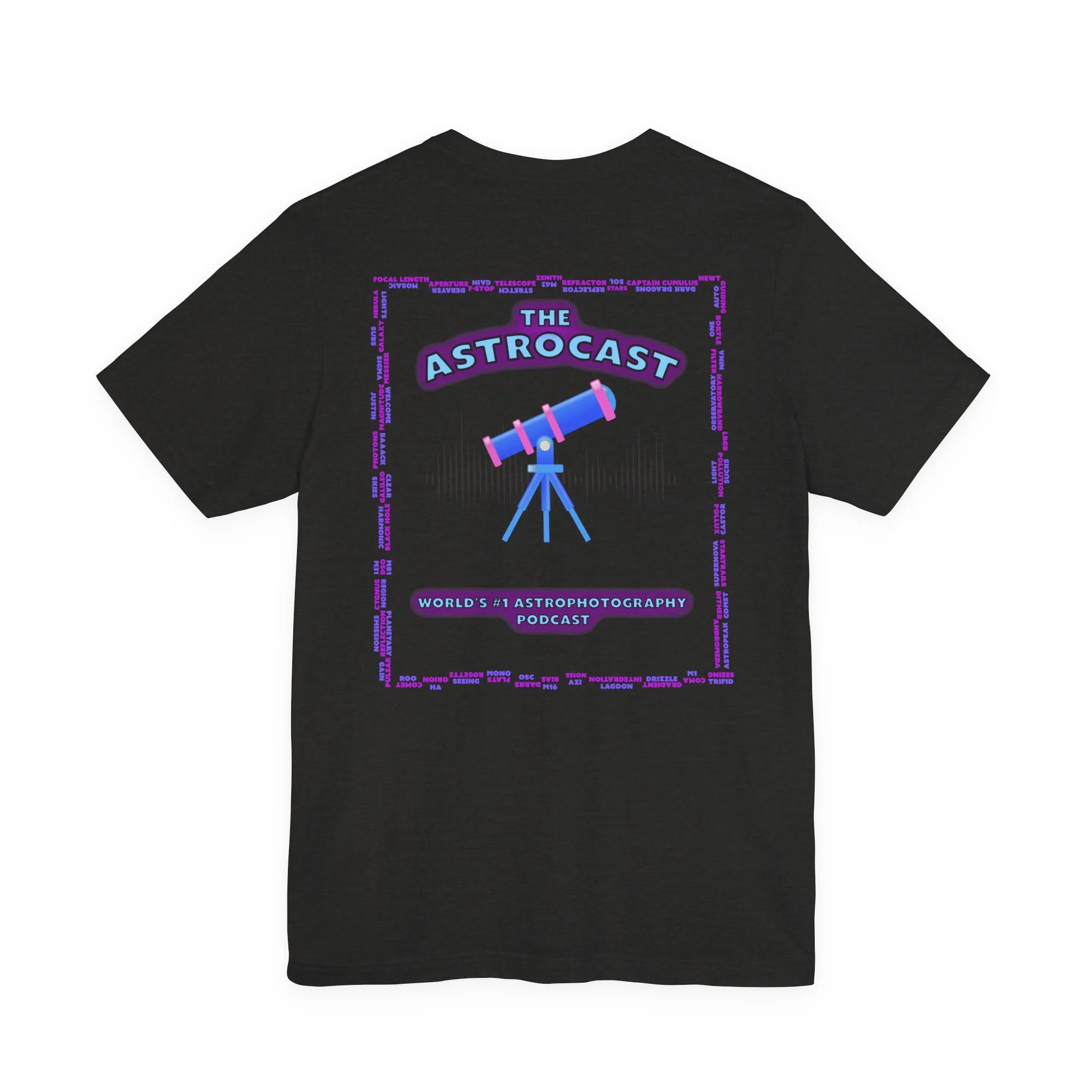Lightweight and soft, this jersey tee carries a quiet enthusiasm for night skies and small telescopes. The front features The Astrocast logo over the heart, while the back opens into a framed, retro-inspired design that reads “The Astrocast”, framed by terms only true AP nerds will know and understand. The shirt breathes easily for late-night stargazing, outdoor meetups, or low-key studio days, and the clean crew neckline keeps the look tidy under a jacket or layered with a flannel. Wear on your next dark sky trip and gain a +1 coolness modifier.