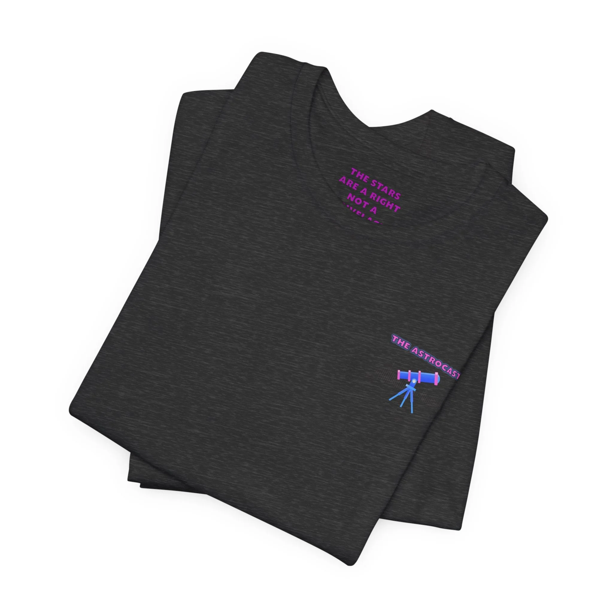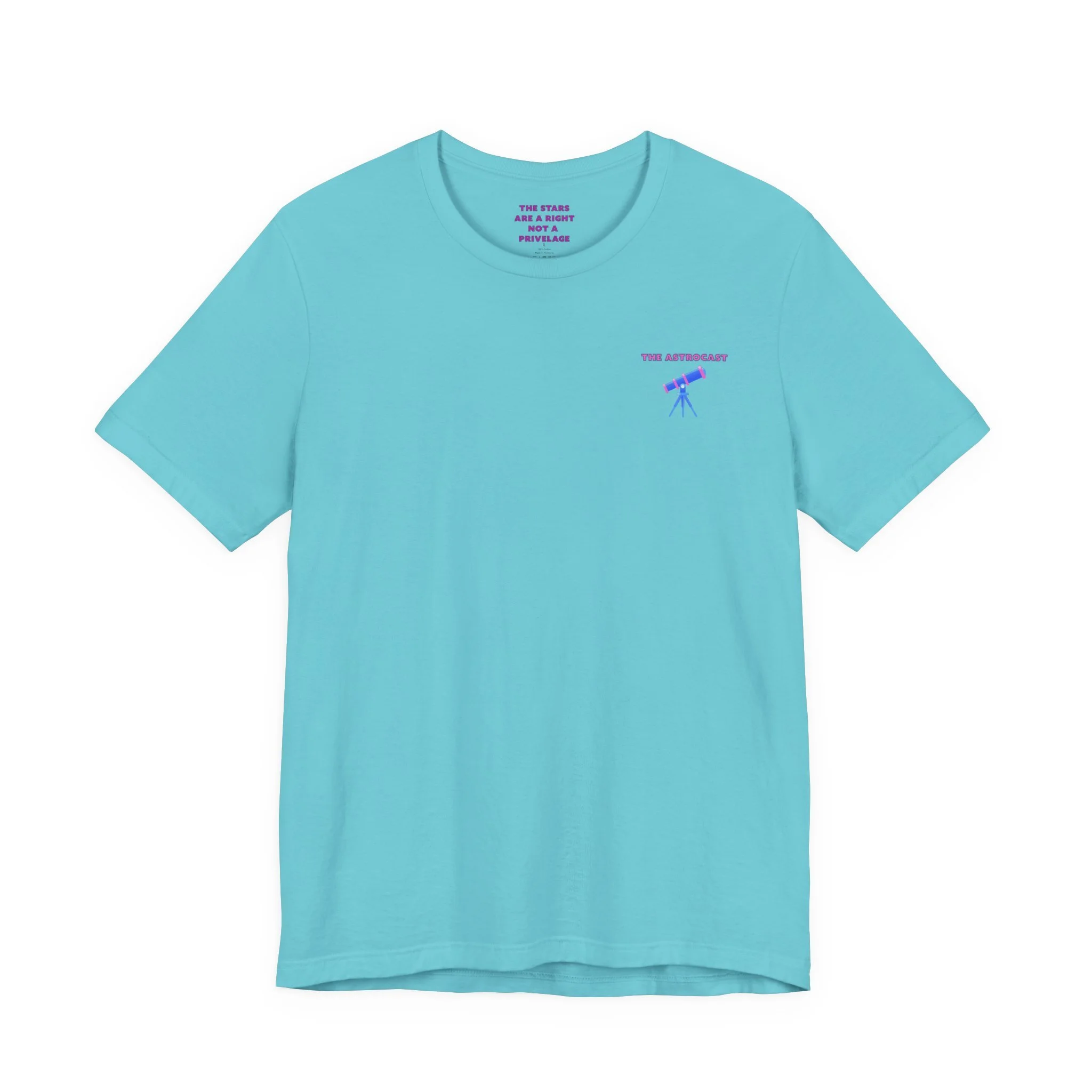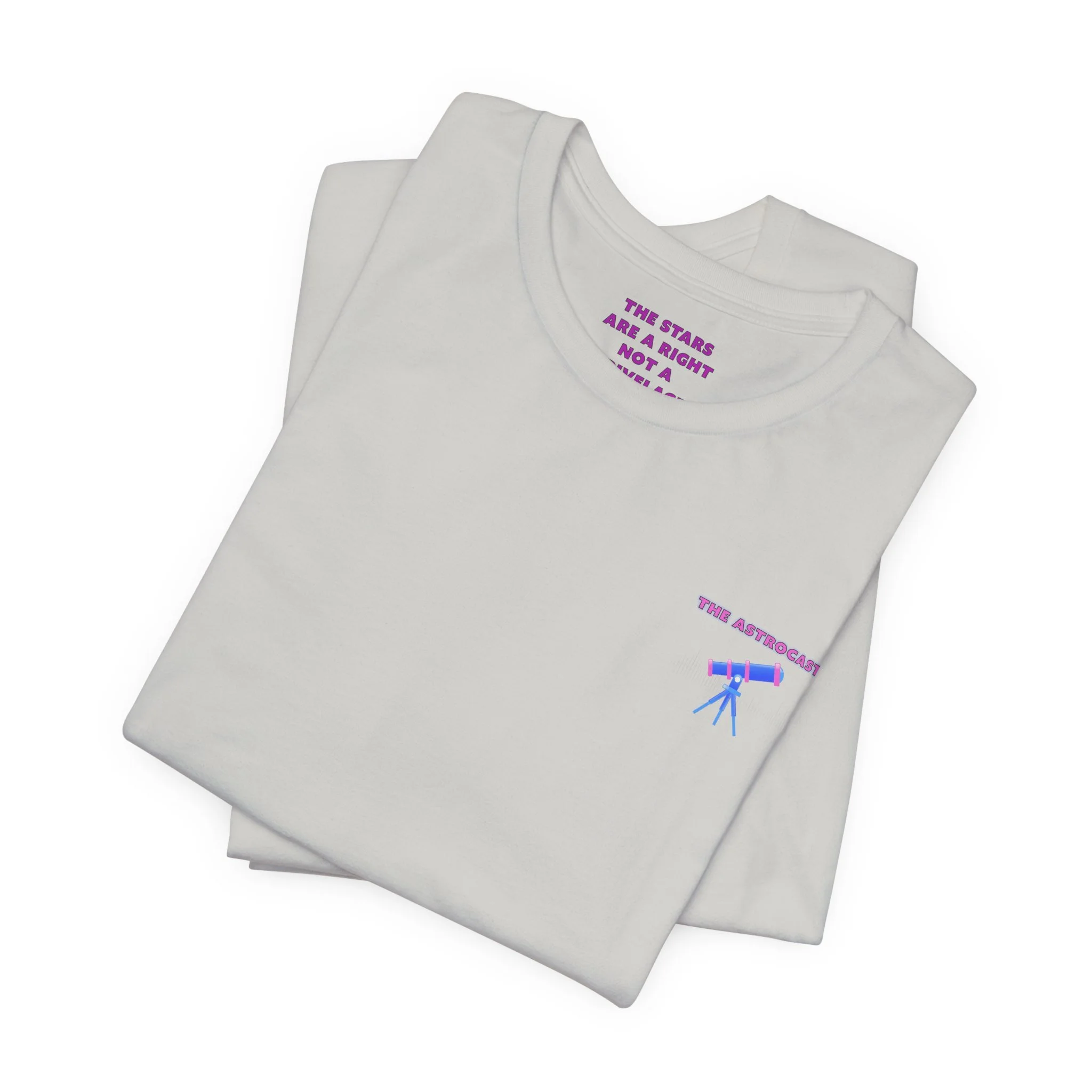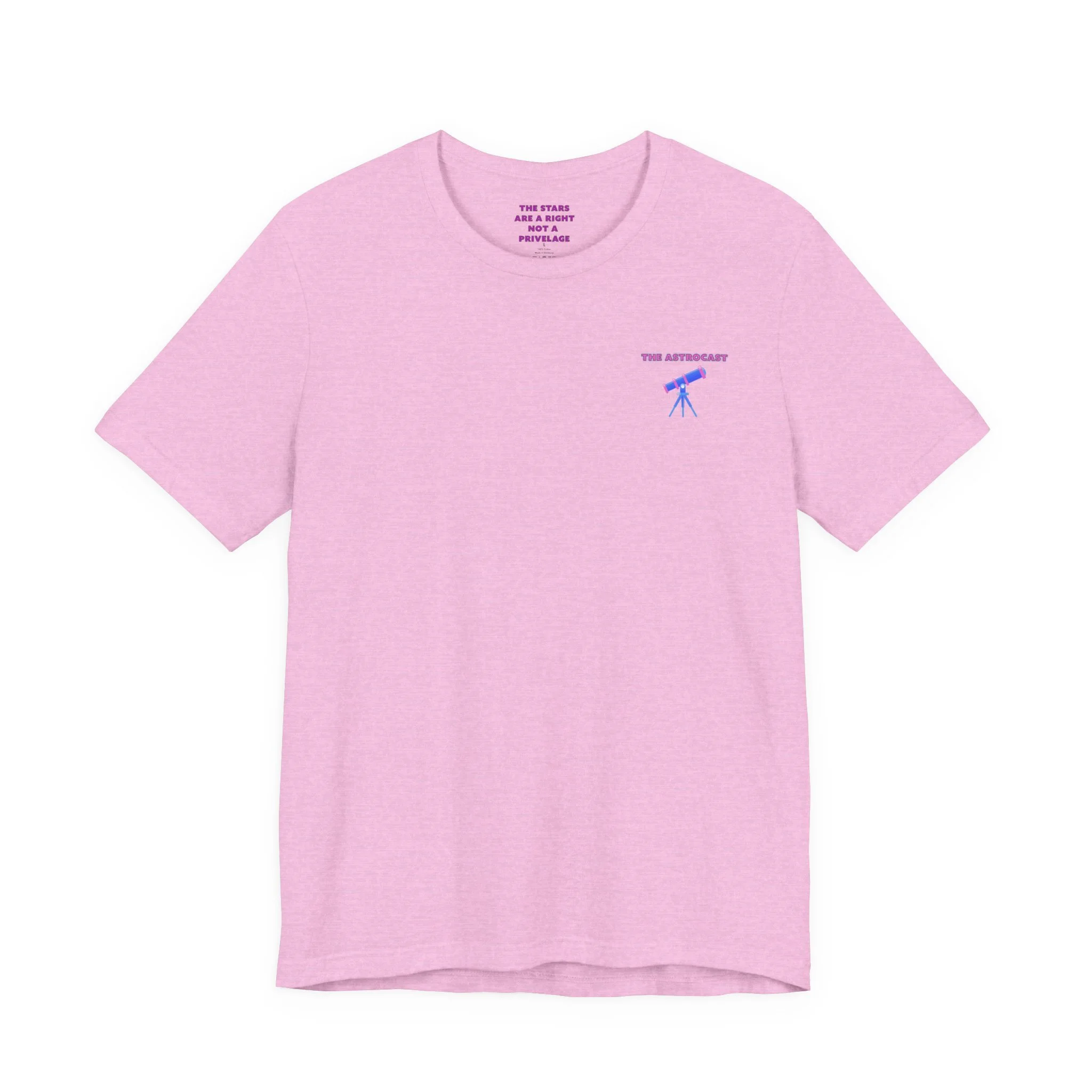 Lightweight and soft, this jersey tee carries a quiet enthusiasm for night skies and small telescopes. The front features The Astrocast logo over the heart, while the back opens into a framed, retro-inspired design that reads “The Astrocast”, framed by terms only true AP nerds will know and understand. The shirt breathes easily for late-night stargazing, outdoor meetups, or low-key studio days, and the clean crew neckline keeps the look tidy under a jacket or layered with a flannel. Wear on your next dark sky trip and gain a +1 coolness modifier.